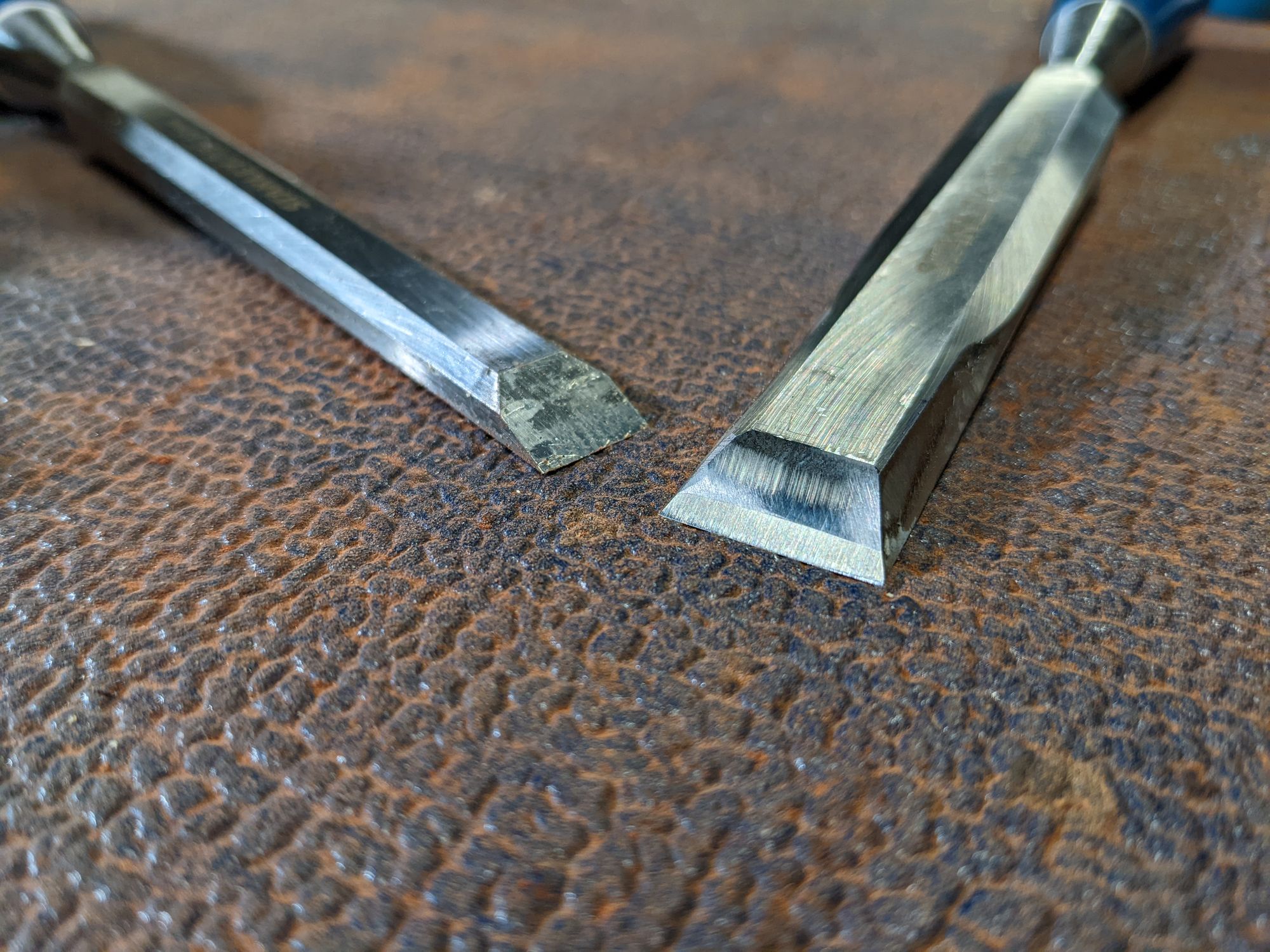 The soft steel makes it easy to create a razor sharp cutting edge freehand on waterstones. However, the hard layer is brittle. And I was getting impatient and wailing on a 6mm chisel with a 1kg lump hammer. Lesson learned.